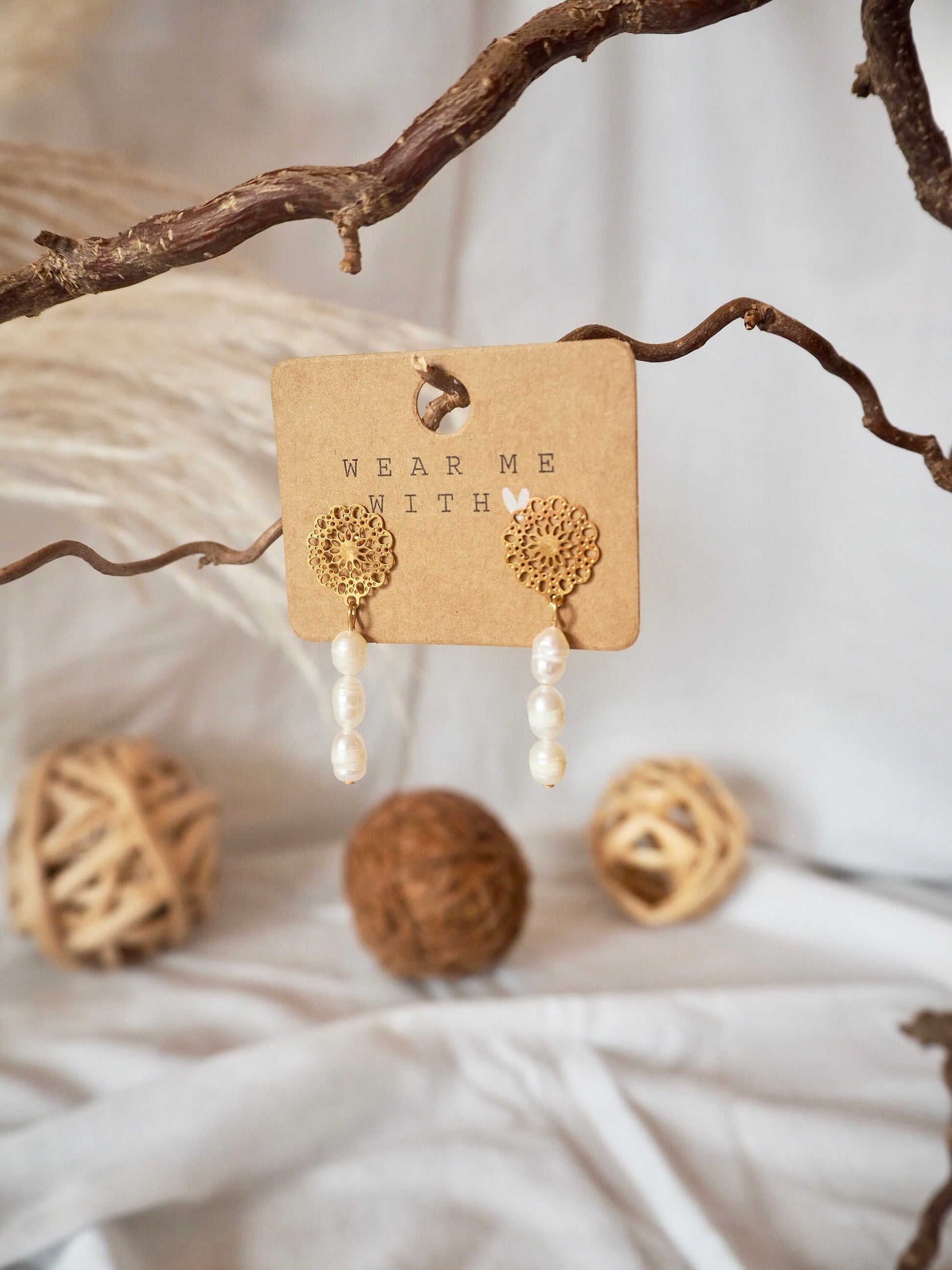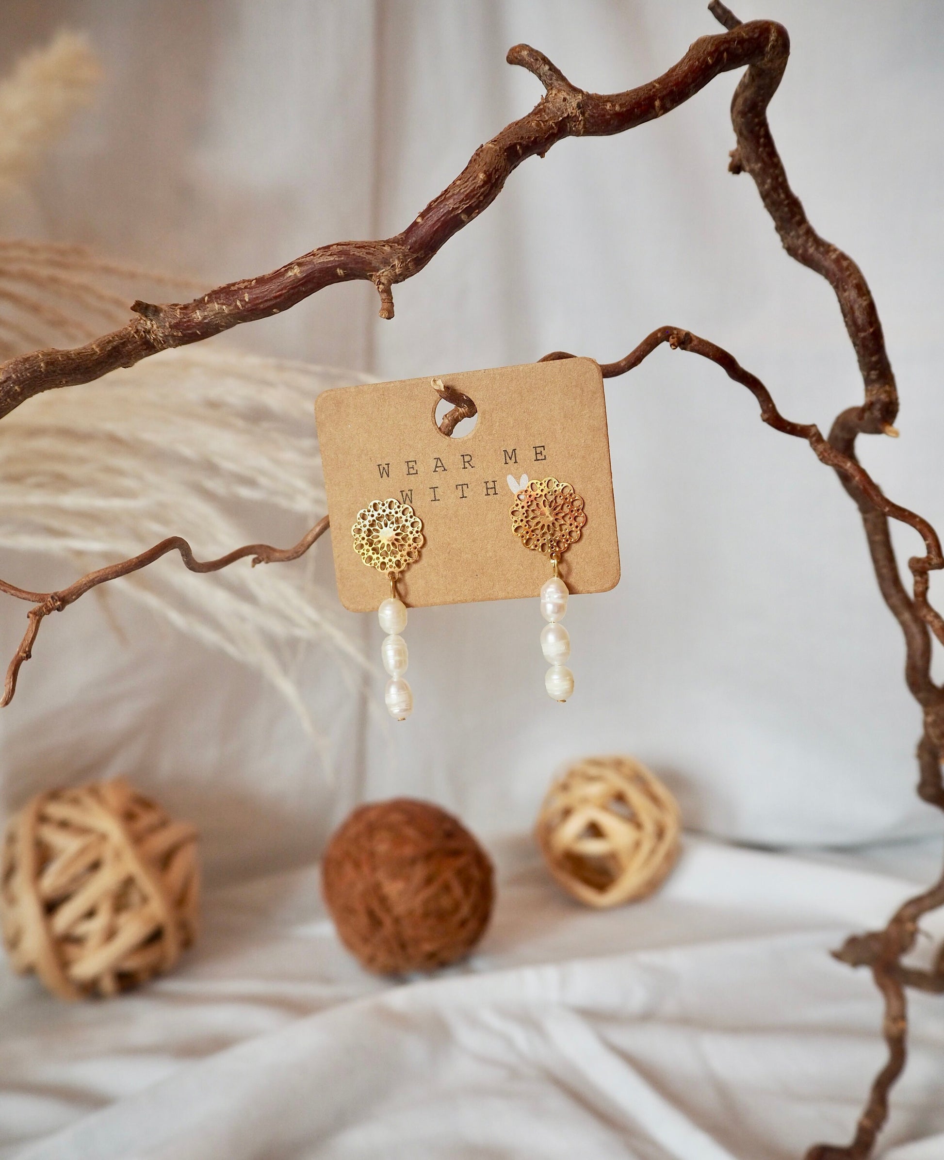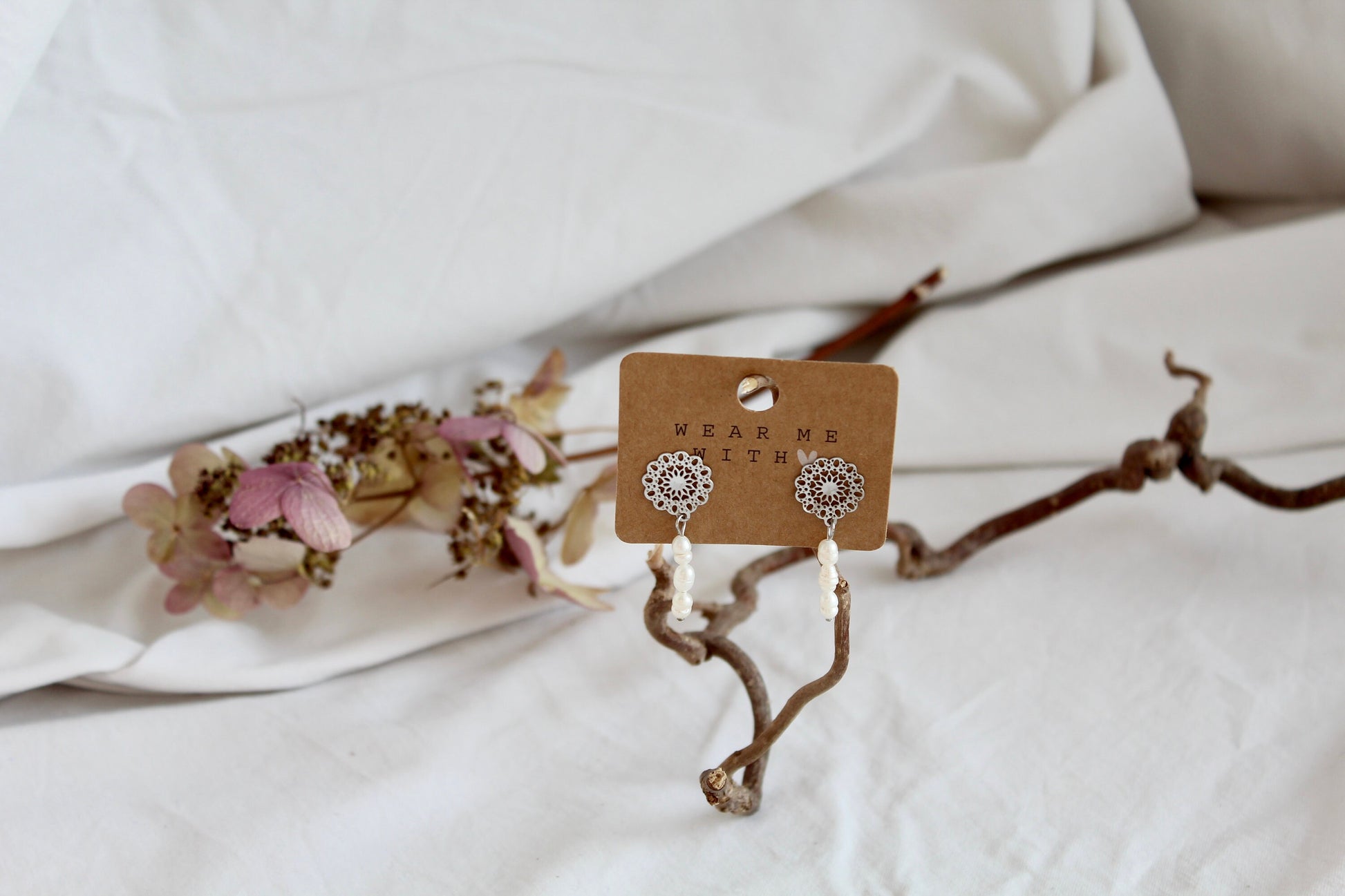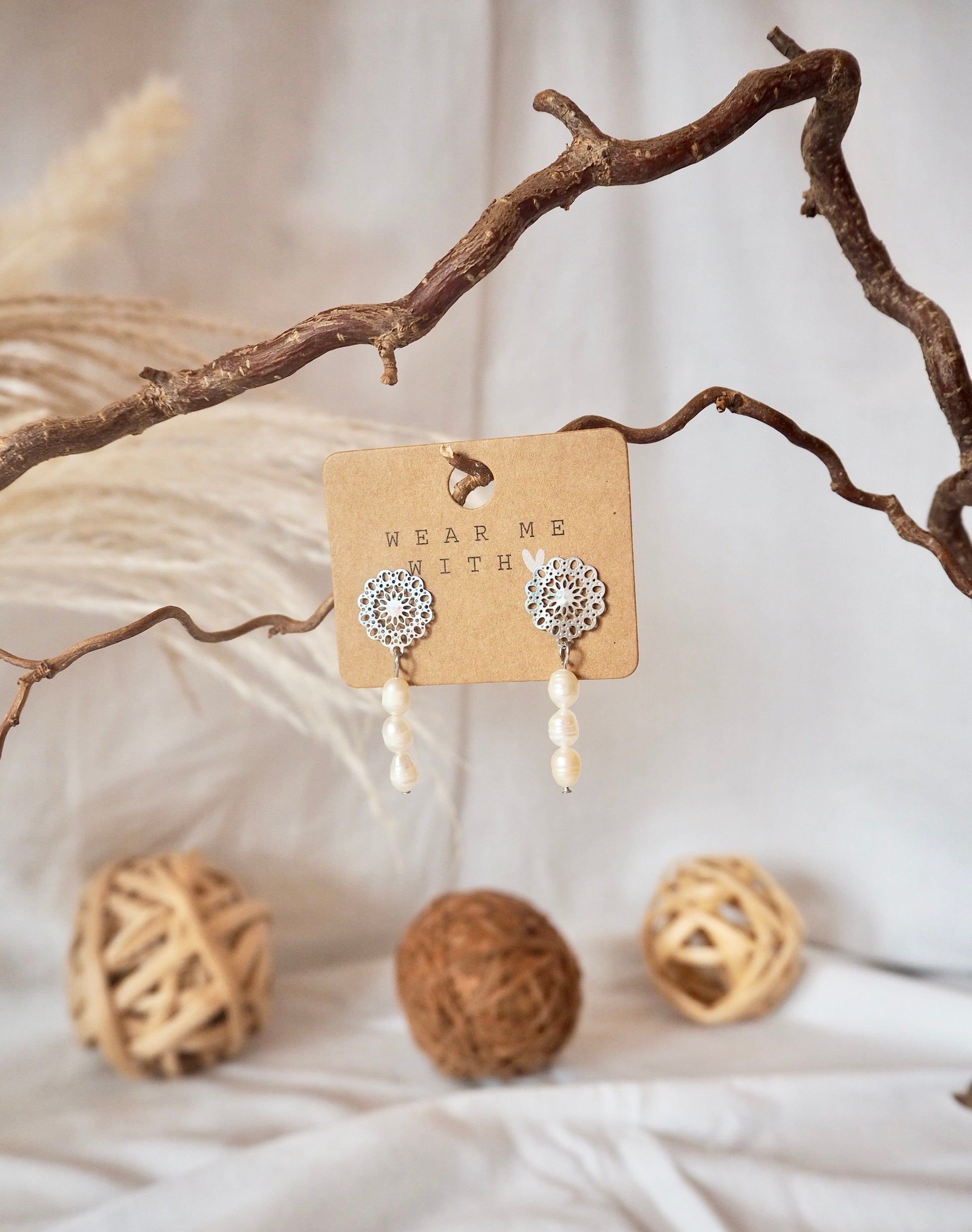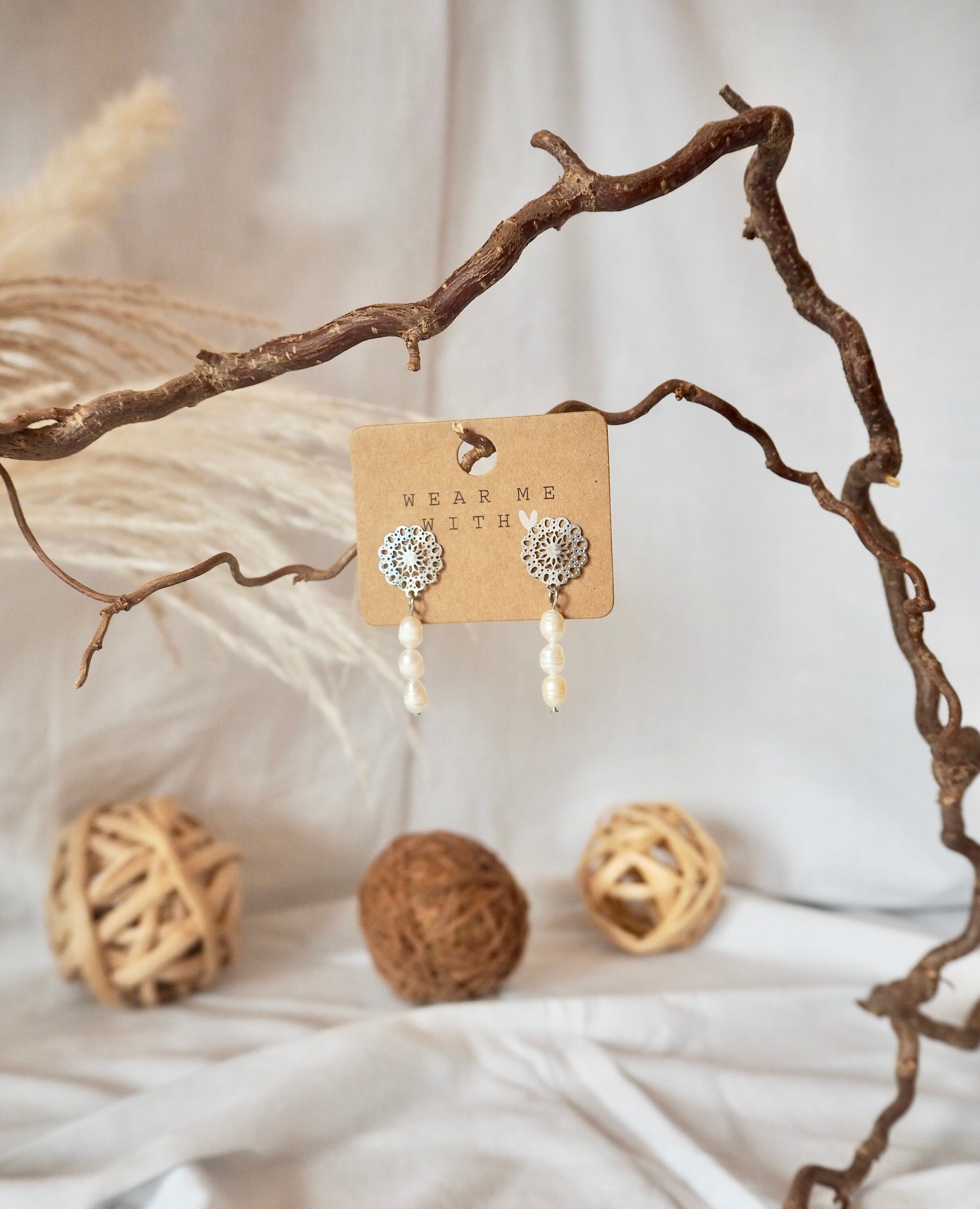 Lebensblume-Ohrstecker mit 3 Süßwasserperlen