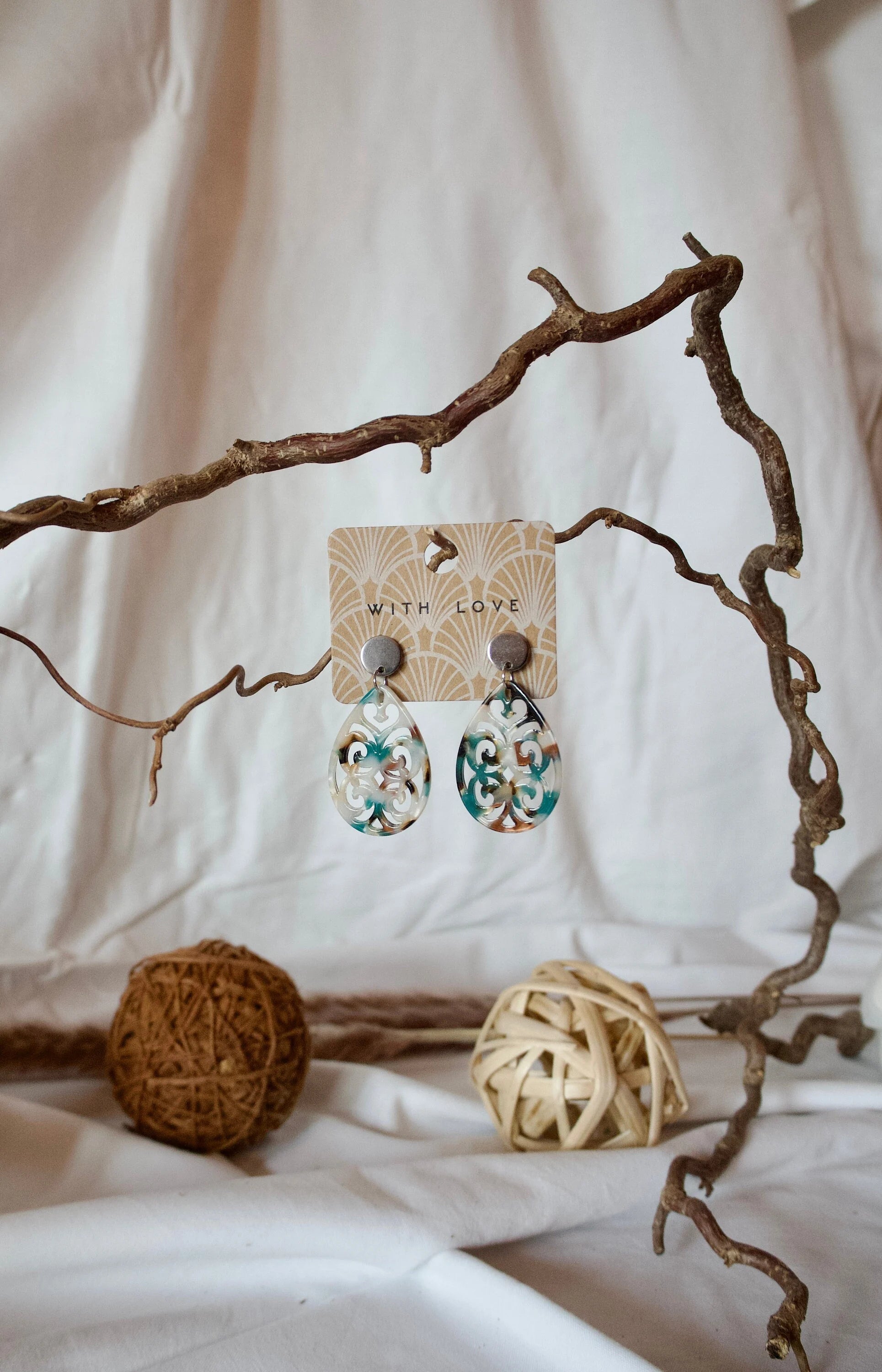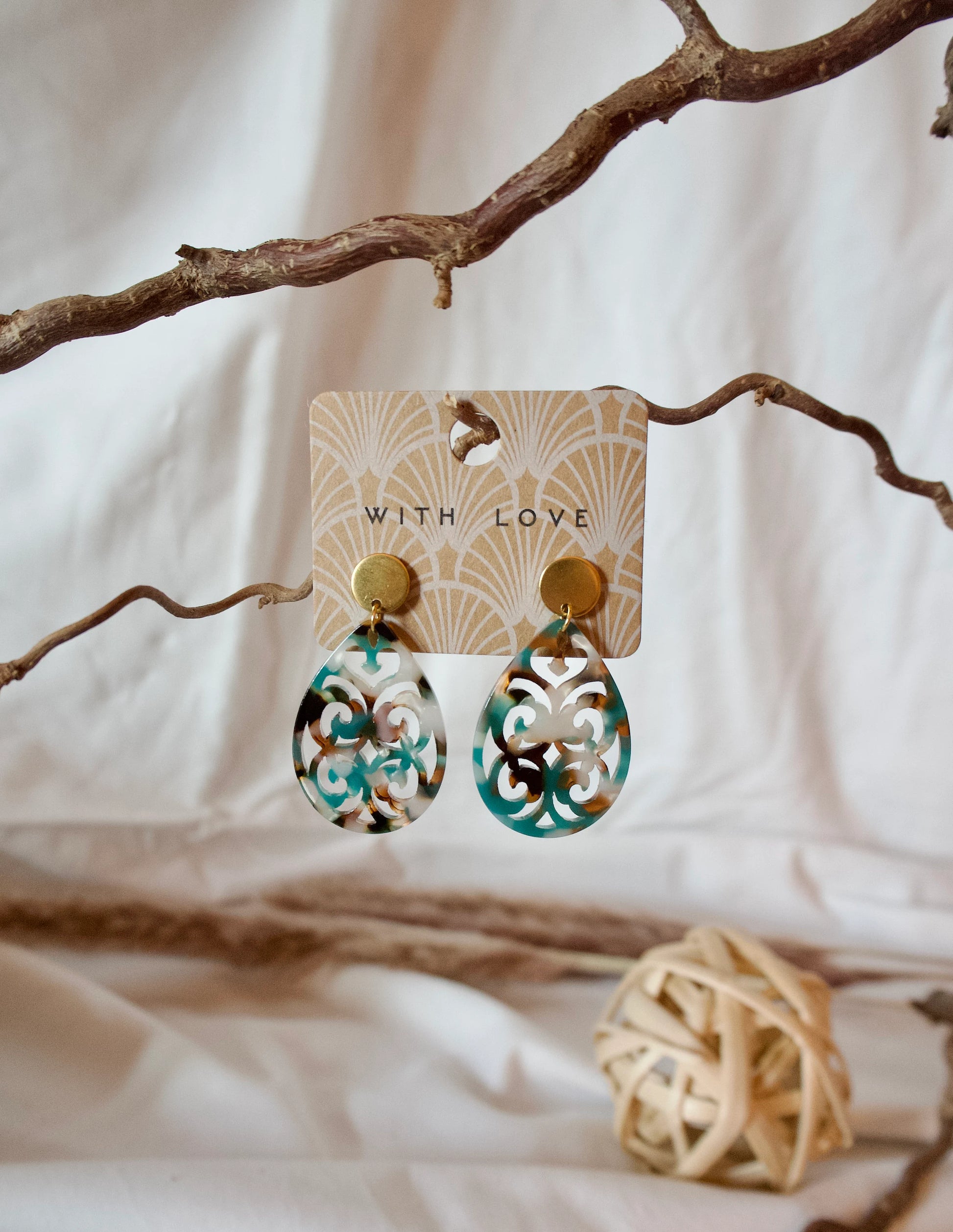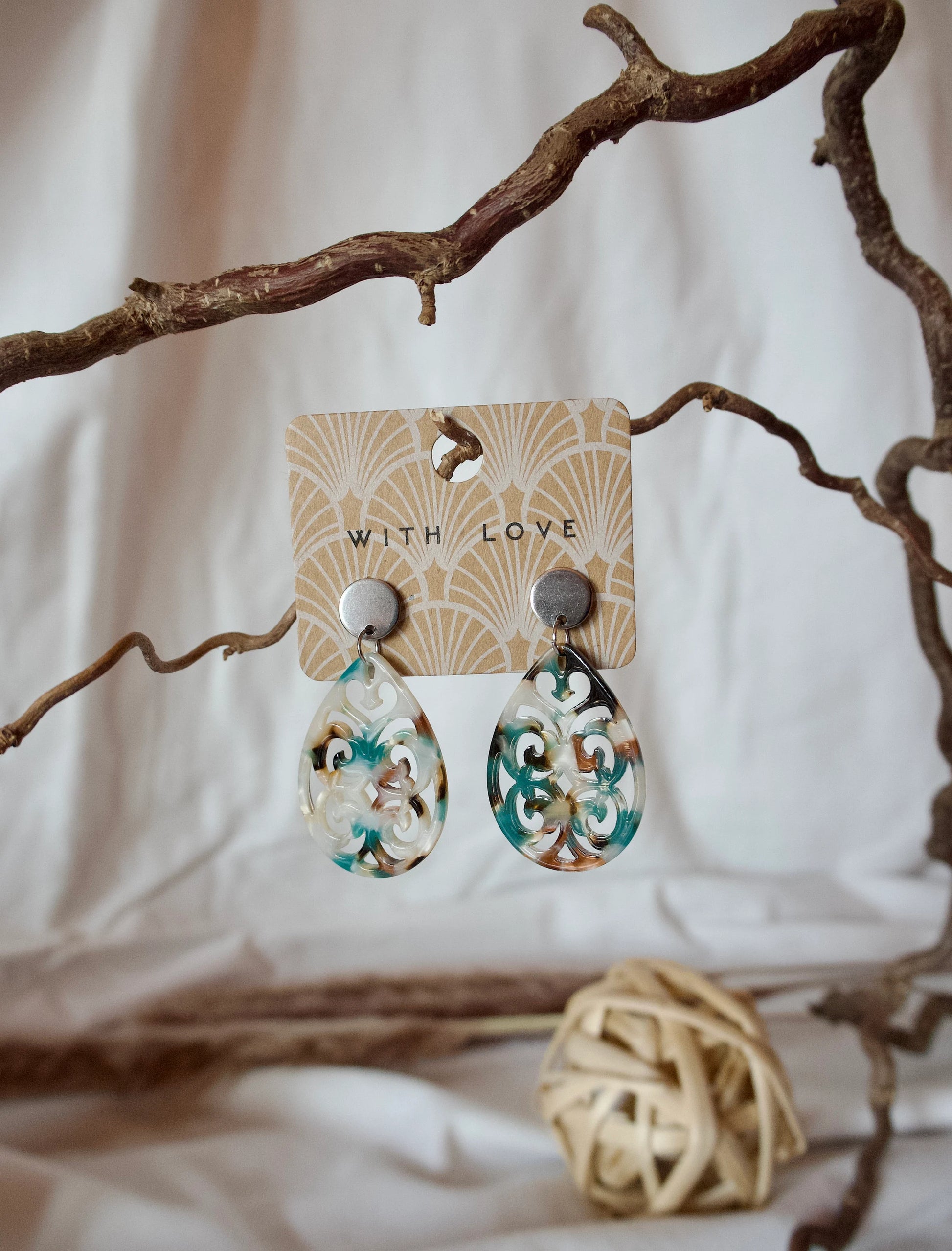 Ohrringe mit Resin-Ornament Tropfen türkis/braun gemustert