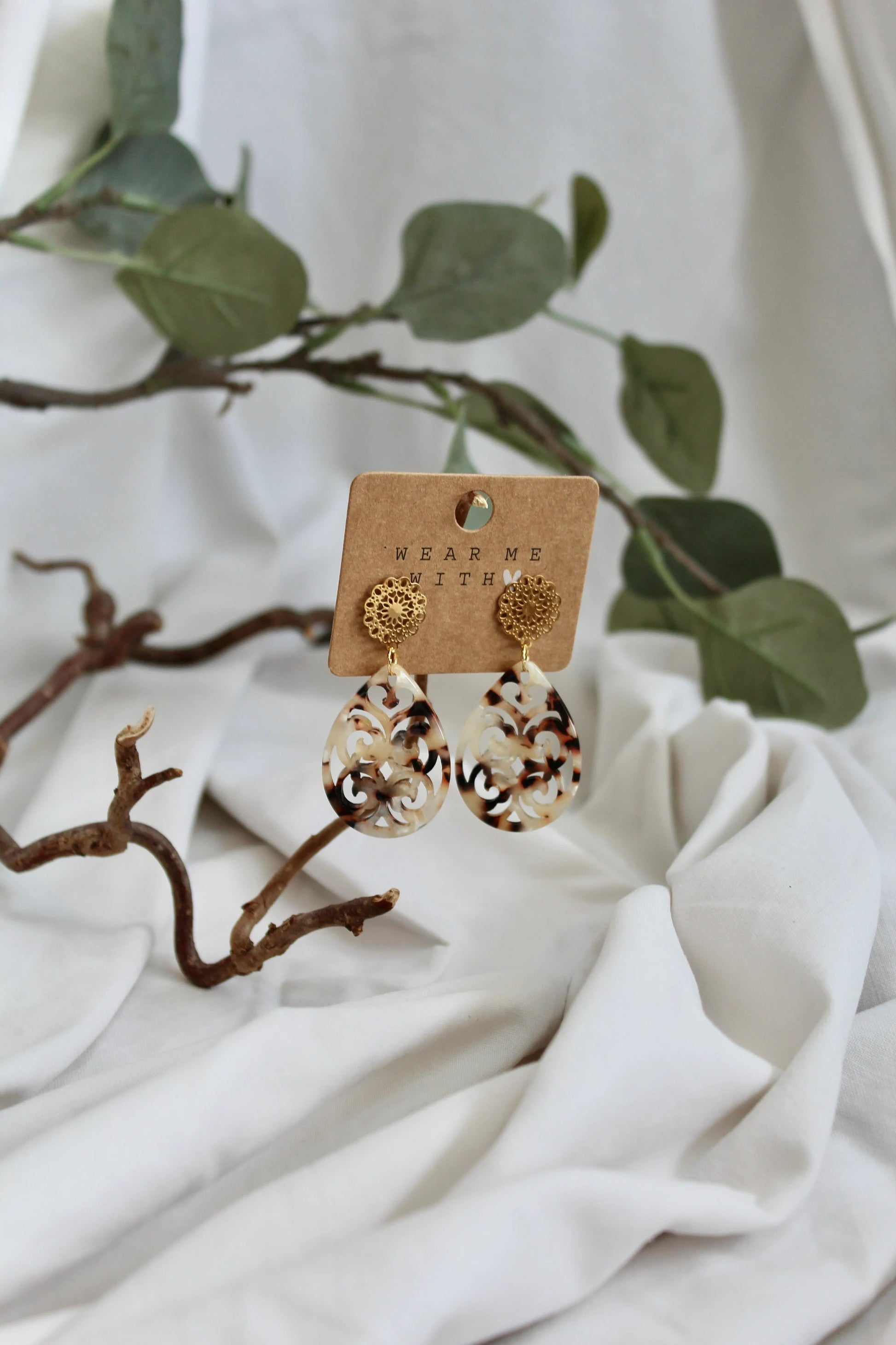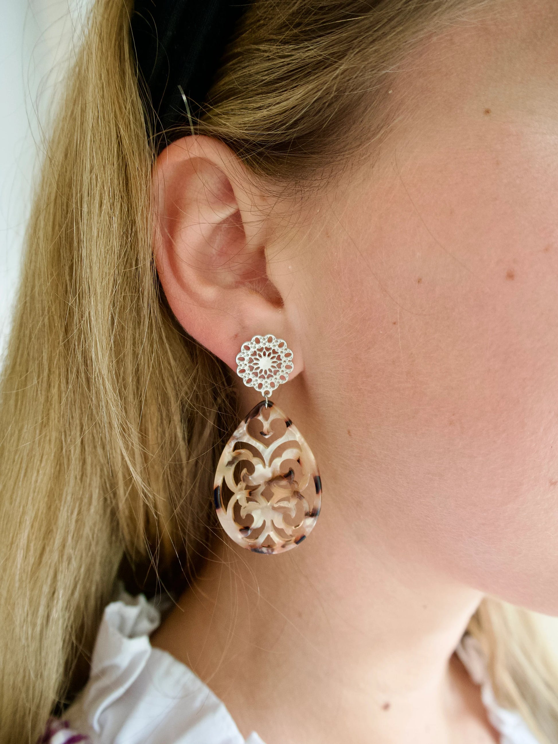 Ohrringe mit Resin-Ornament Tropfen in braun-beige gemustert