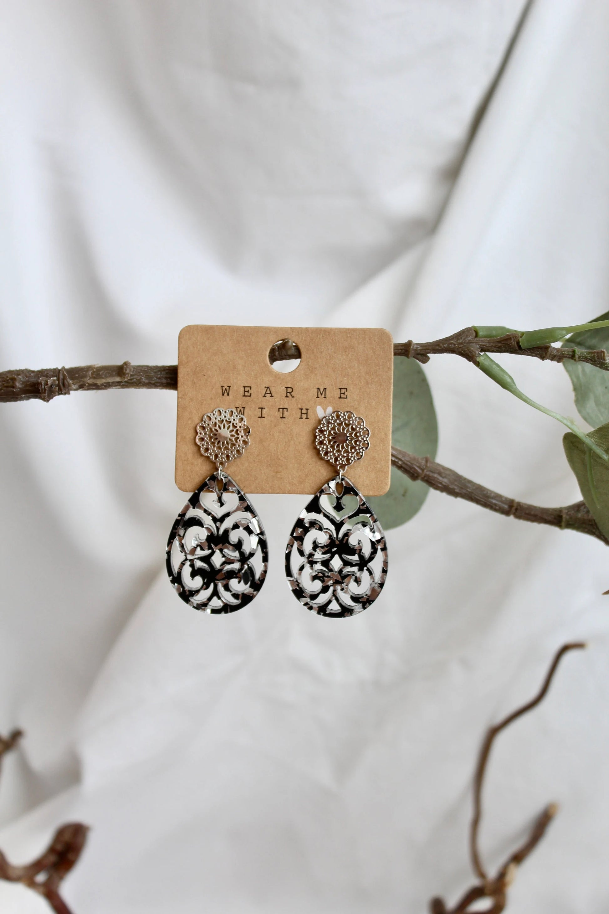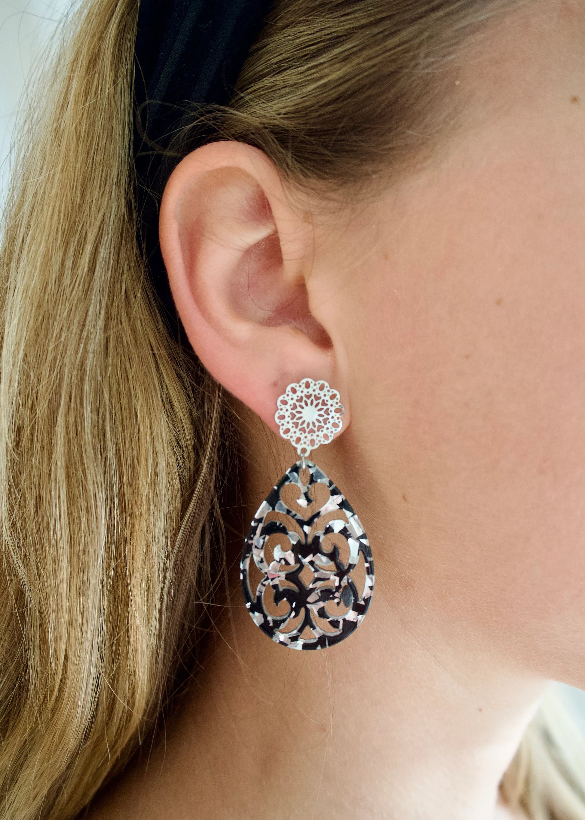 Ohrringe mit Resin-Tropfen-Anhänger gemustert schwarz