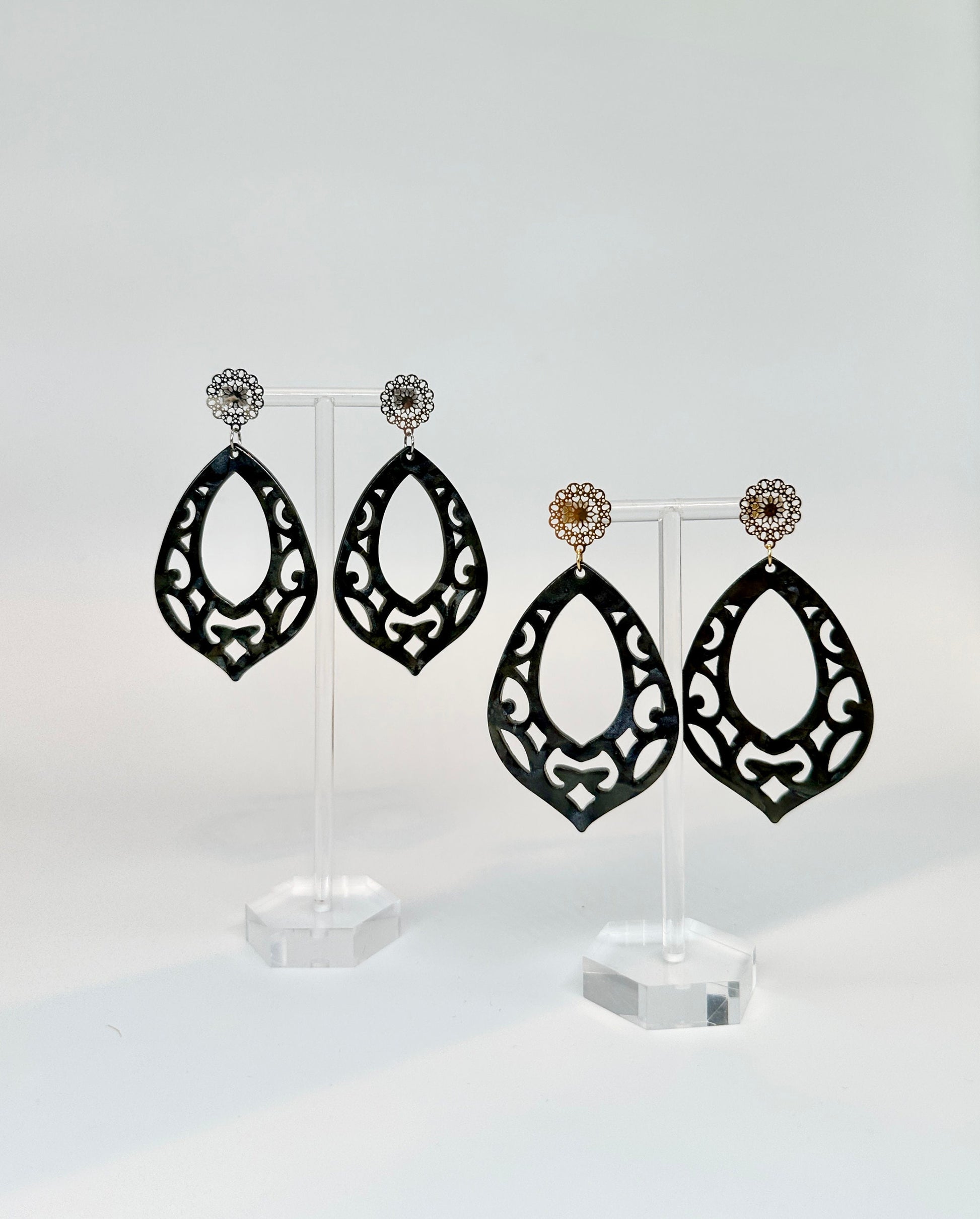 Diese Ohrringe sind ein wahrer Blickfang! Sie sind alltagstauglich aber genau so können sie auch bei einem Event getragen werden. Egal ob Gold oder Silber, sie sind schick und verspielt aber trotzdem modern und federleicht. Die Ohrringe sind aus rostfreiem Edelstahl gefertigt und sind frei von Blei, Nickel und Cadmium. Die Ornamente sind aus Resin und deswegen federleicht.